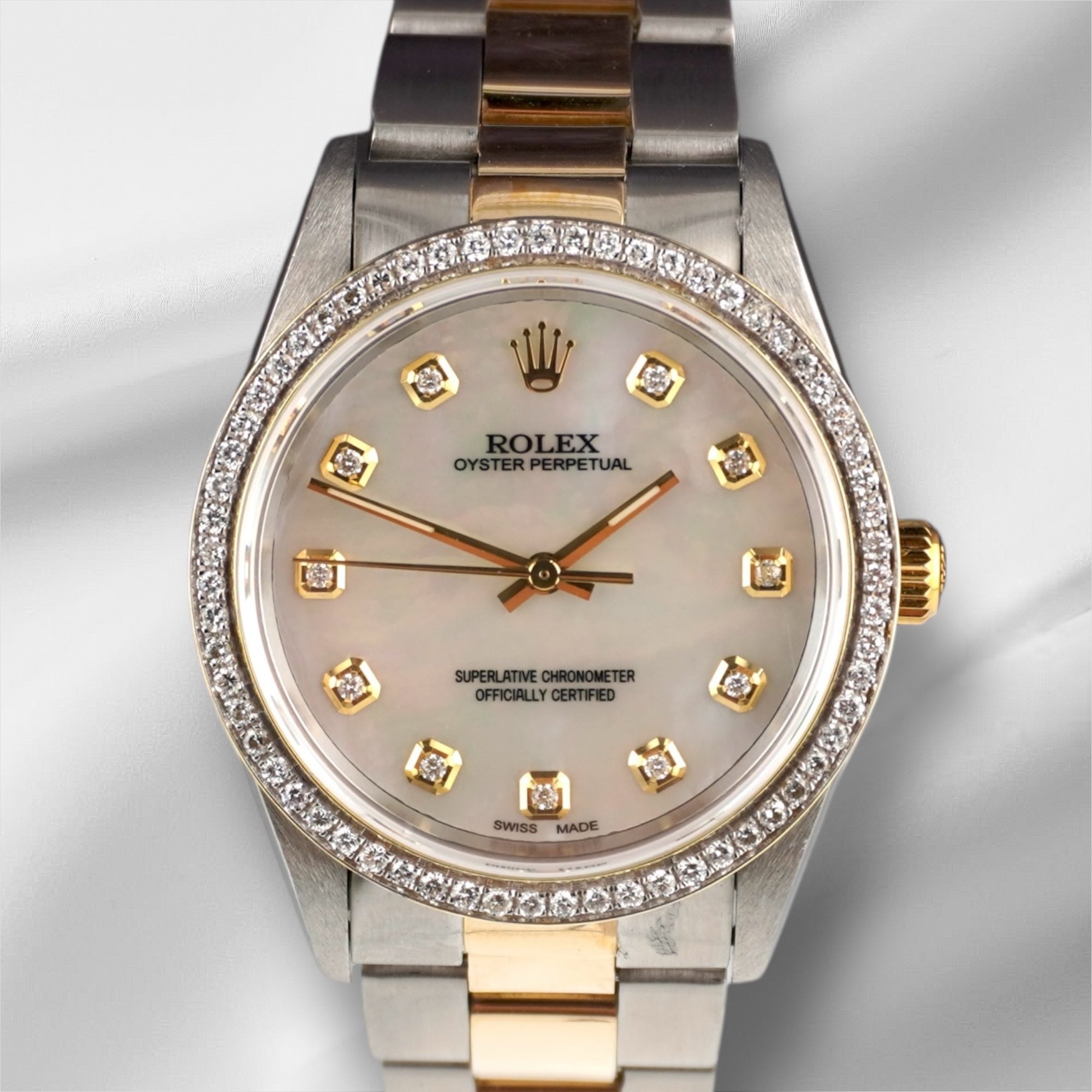 Rolex 34mm Oyster Perpetual 18K YG & Steel Watch 2ct Diamonds White MOP 14233
