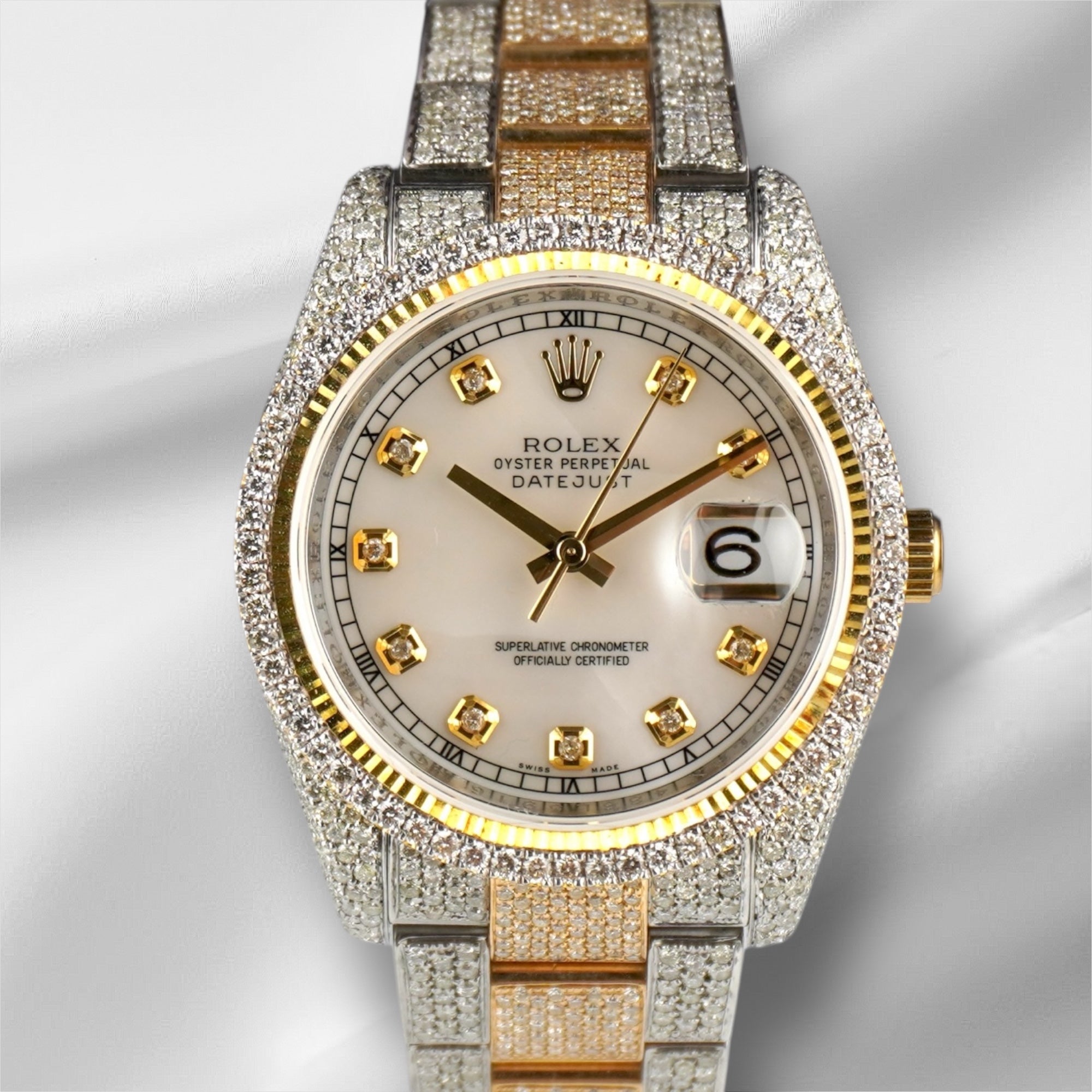 Rolex 36mm Datejust 18k YG/Steel 13ct Iced Out Diamonds White Mop Watch 116233