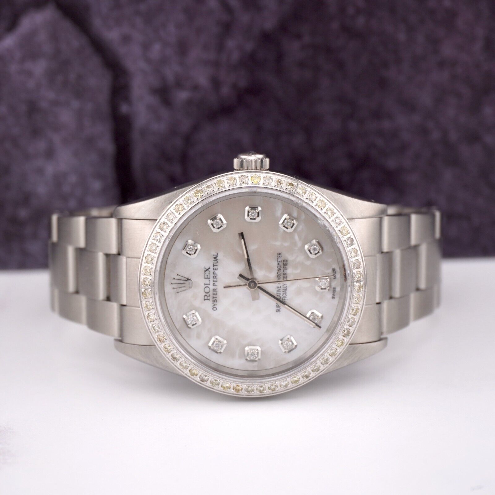 Rolex Oyster Perpetual 34mm Ladies 1.50ct Diamond White MOP Dial Steel Watch