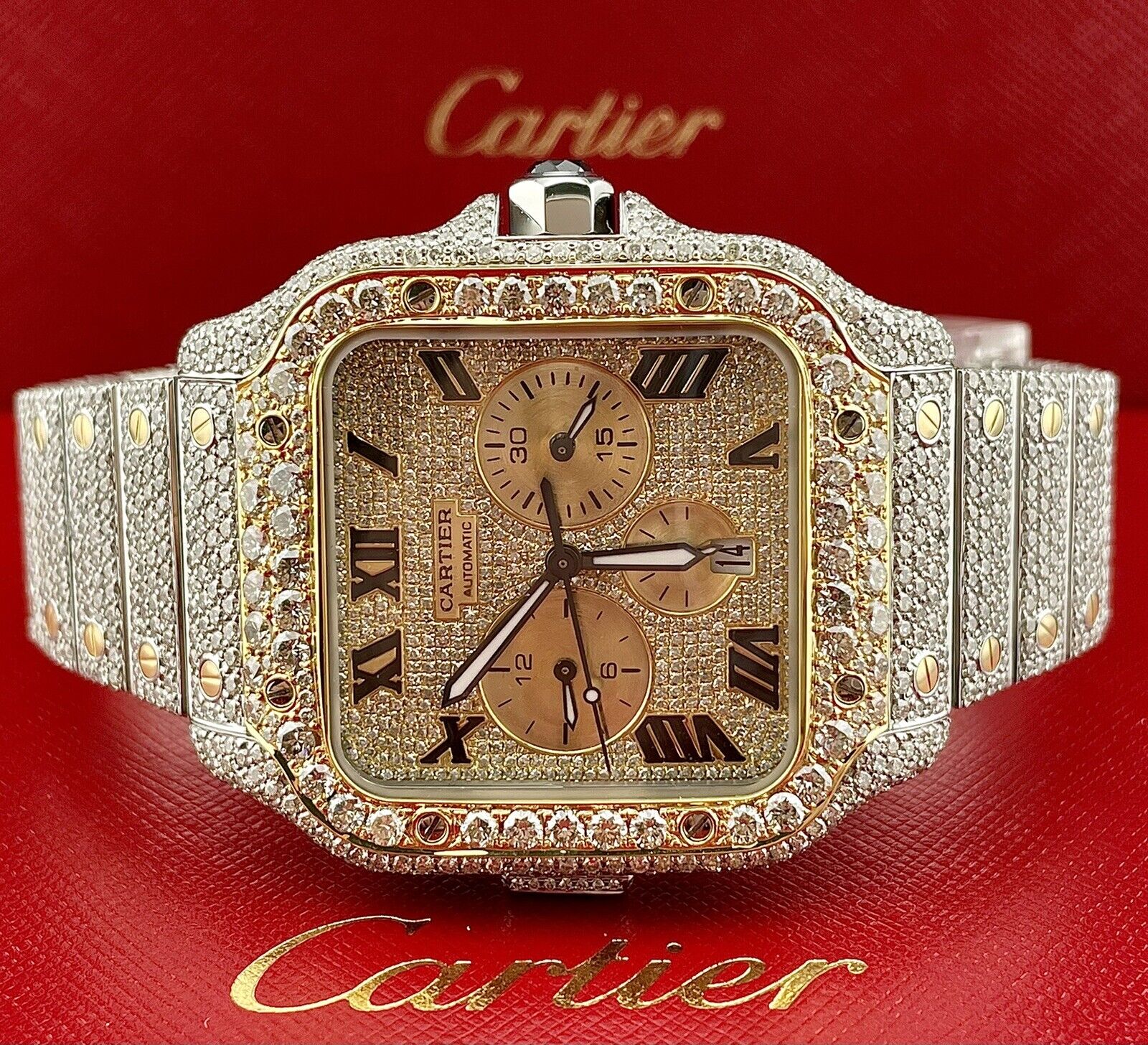 Cartier Santos 45mm XL Chrono Men's 18k Gold & Steel Watch 25ct Iced Diamonds