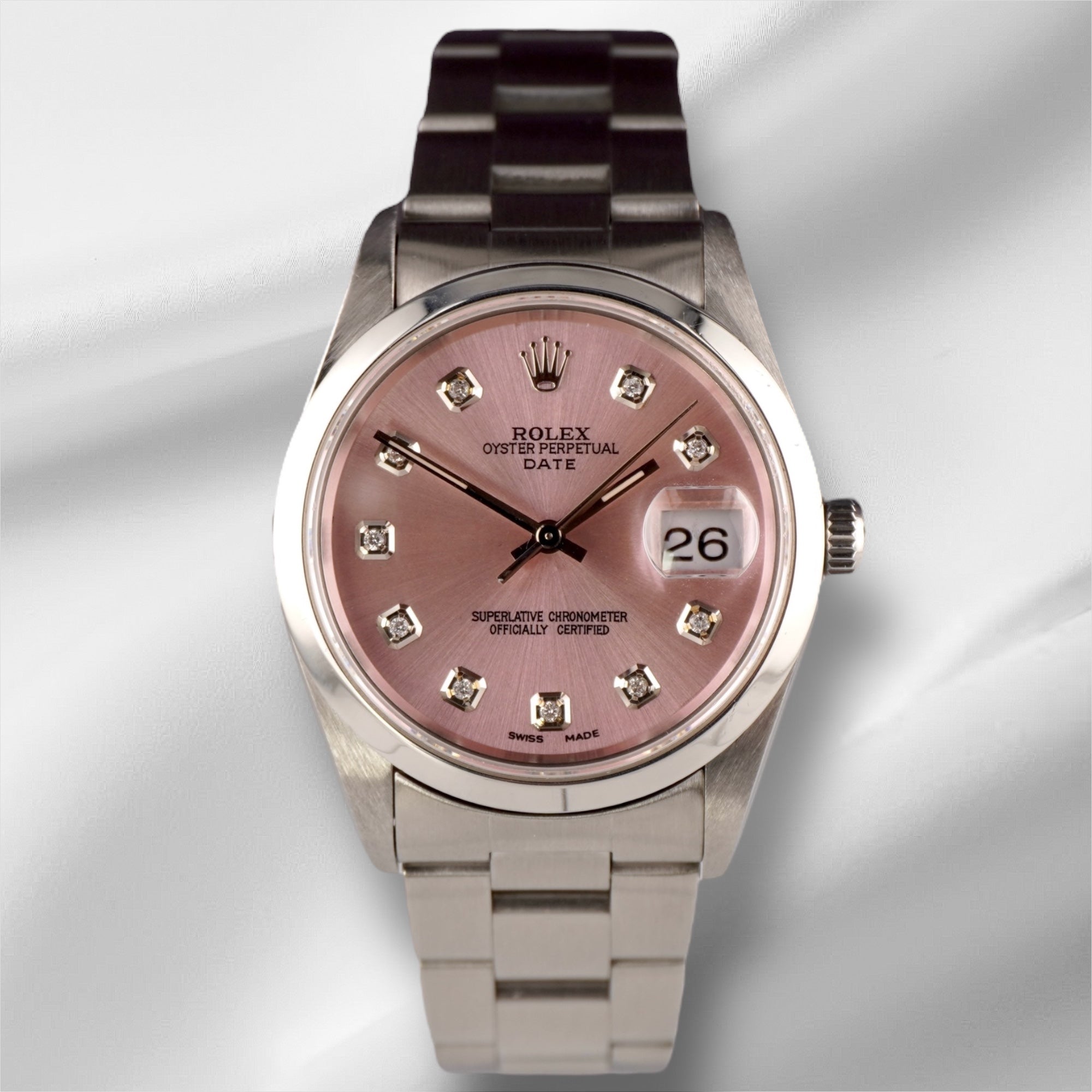 Rolex Date 34mm Ladies Pink Diamond Dial Oyster Steel Watch 15000