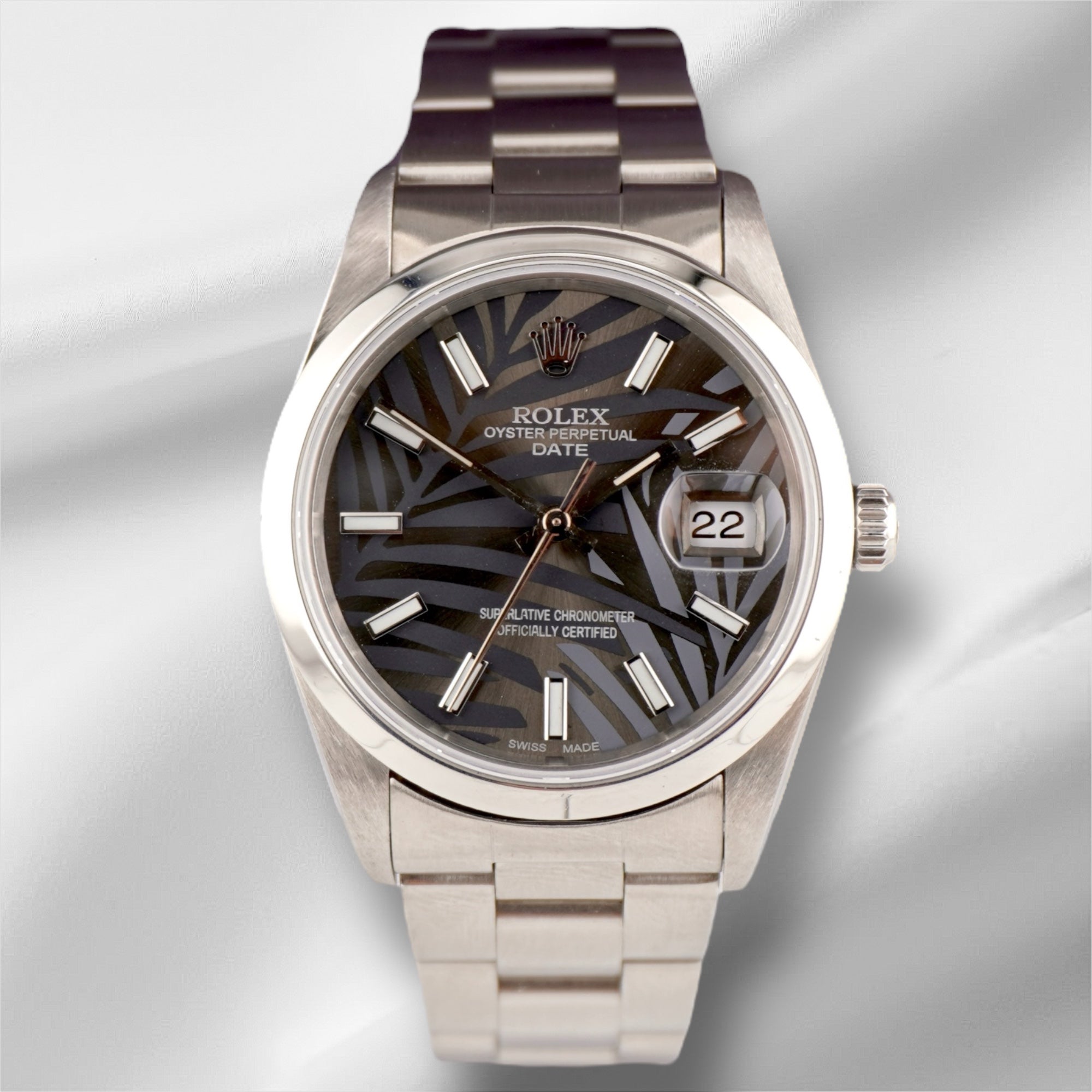 Rolex Date 34mm Ladies Grey Palm Dial Oyster Steel Watch 15000