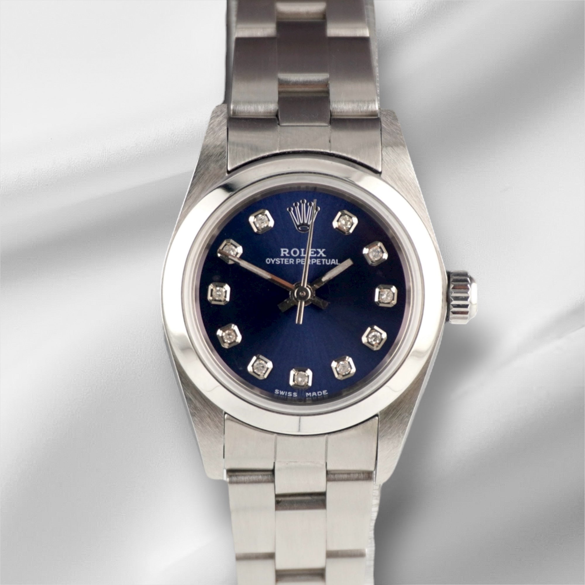 Rolex Oyster Perpetual 25mm Stainless Steel Dark Blue Diamond Dial Watch 67180