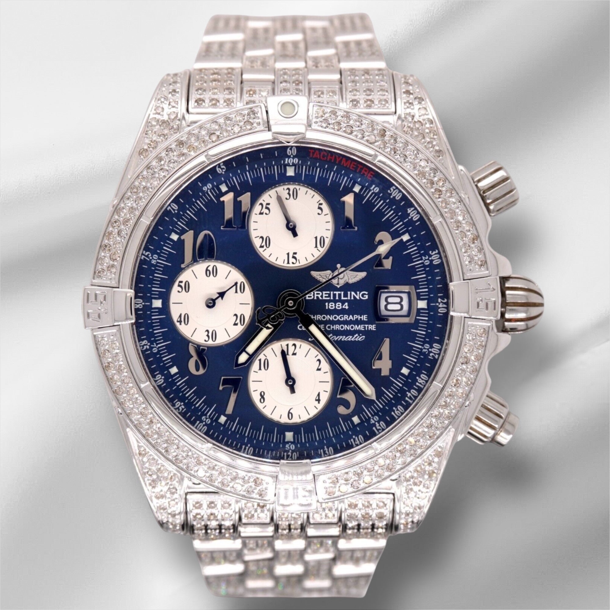 Breitling Chronomat 43mm Chronograph Blue Dial 7ct Mens Steel Auto Watch A13356