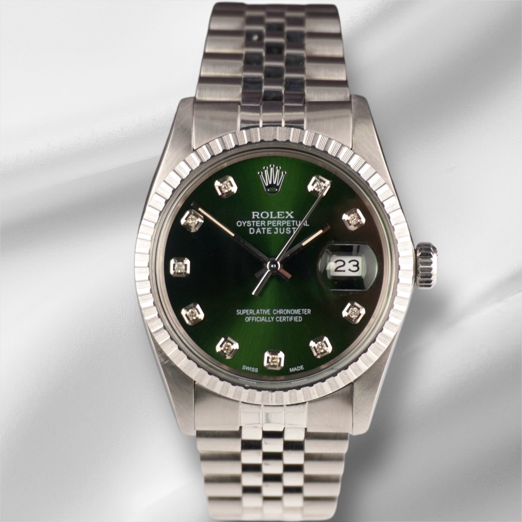 Rolex 36mm Datejust Steel Engine-Turned Jubilee Green Dial Watch 16030