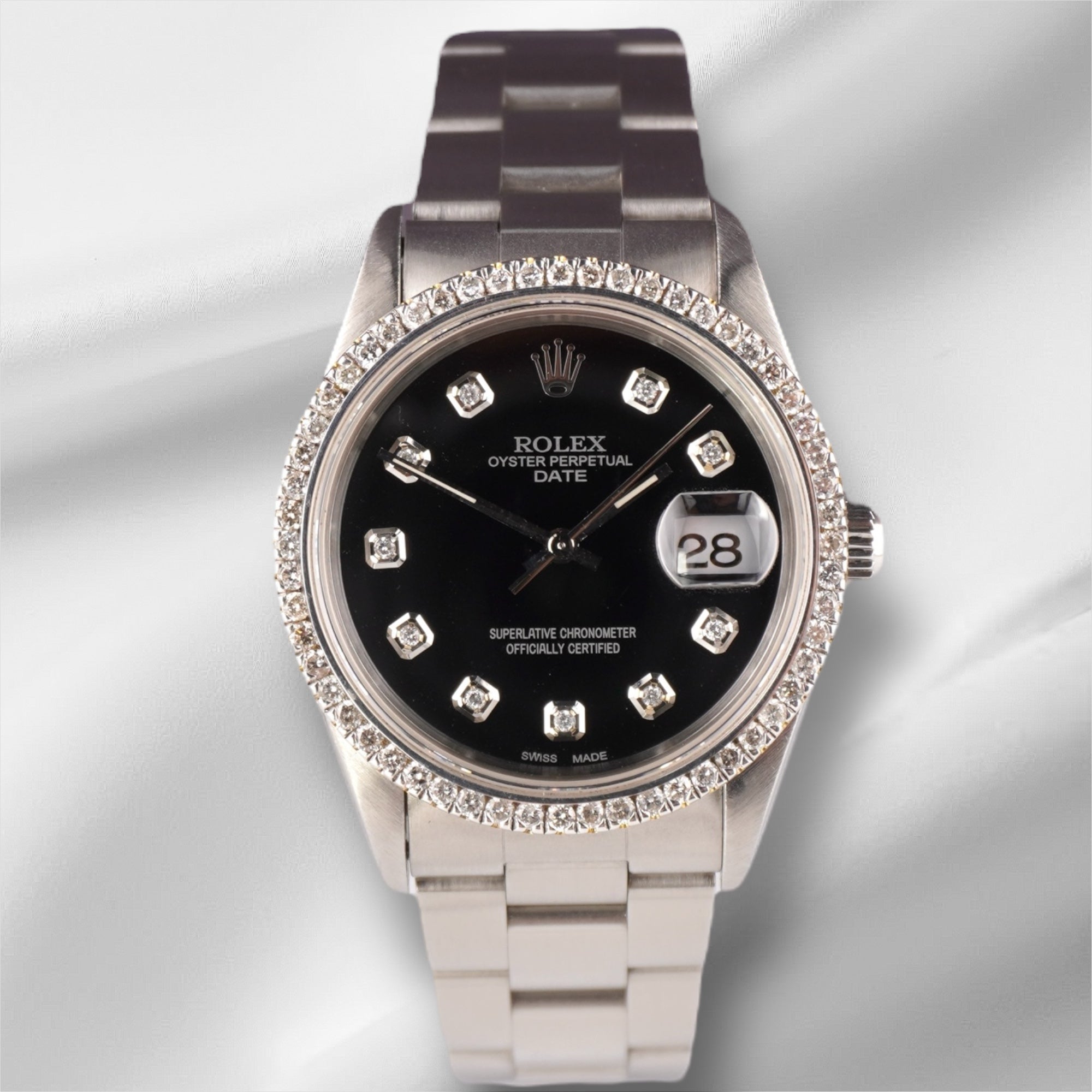 Rolex Date 34mm Ladies 1.5ct Prong Black Diamond Dial Steel Watch 15000