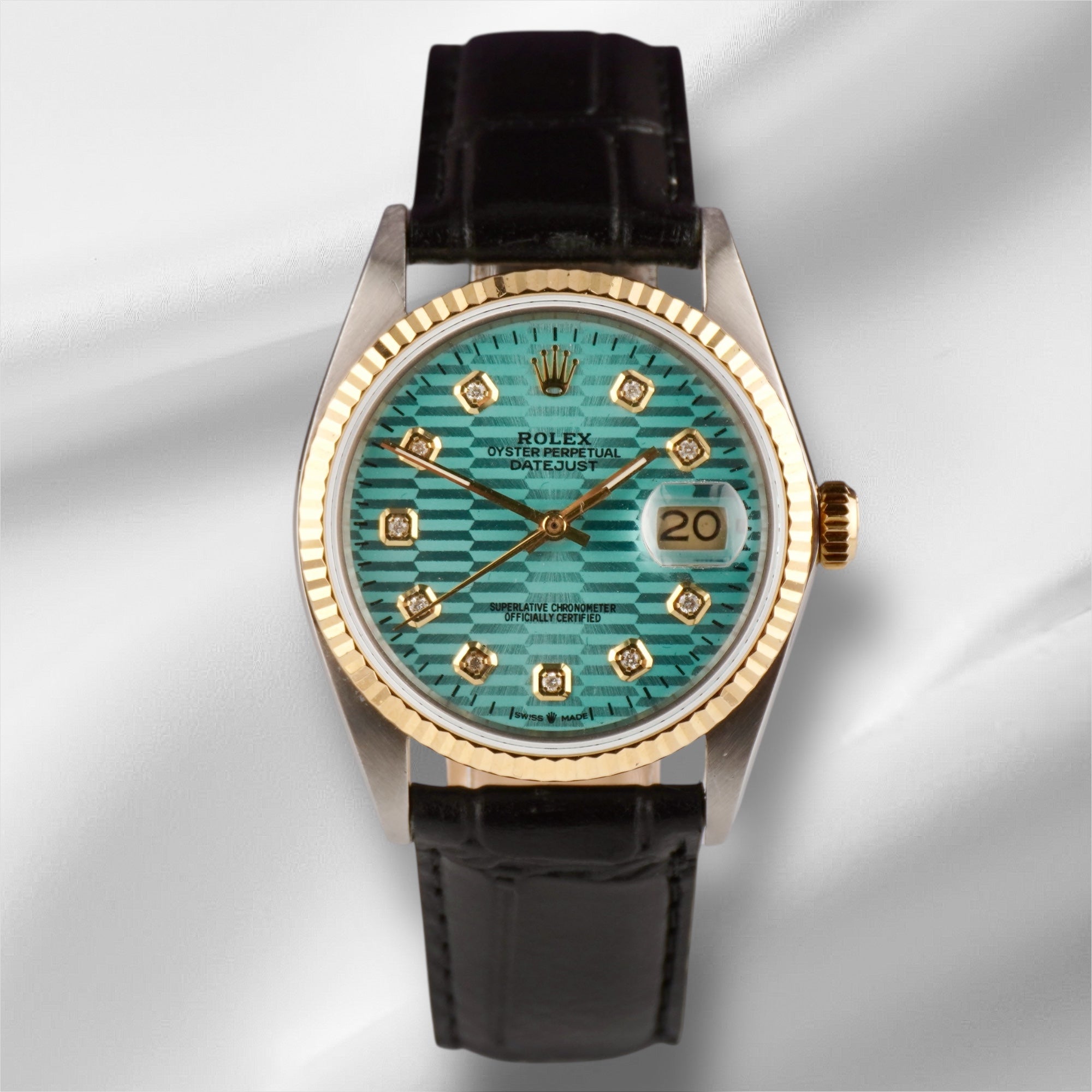 Rolex Datejust 36mm YellowGold Fluted Blue Motif Diamond Dial Leather Band Watch