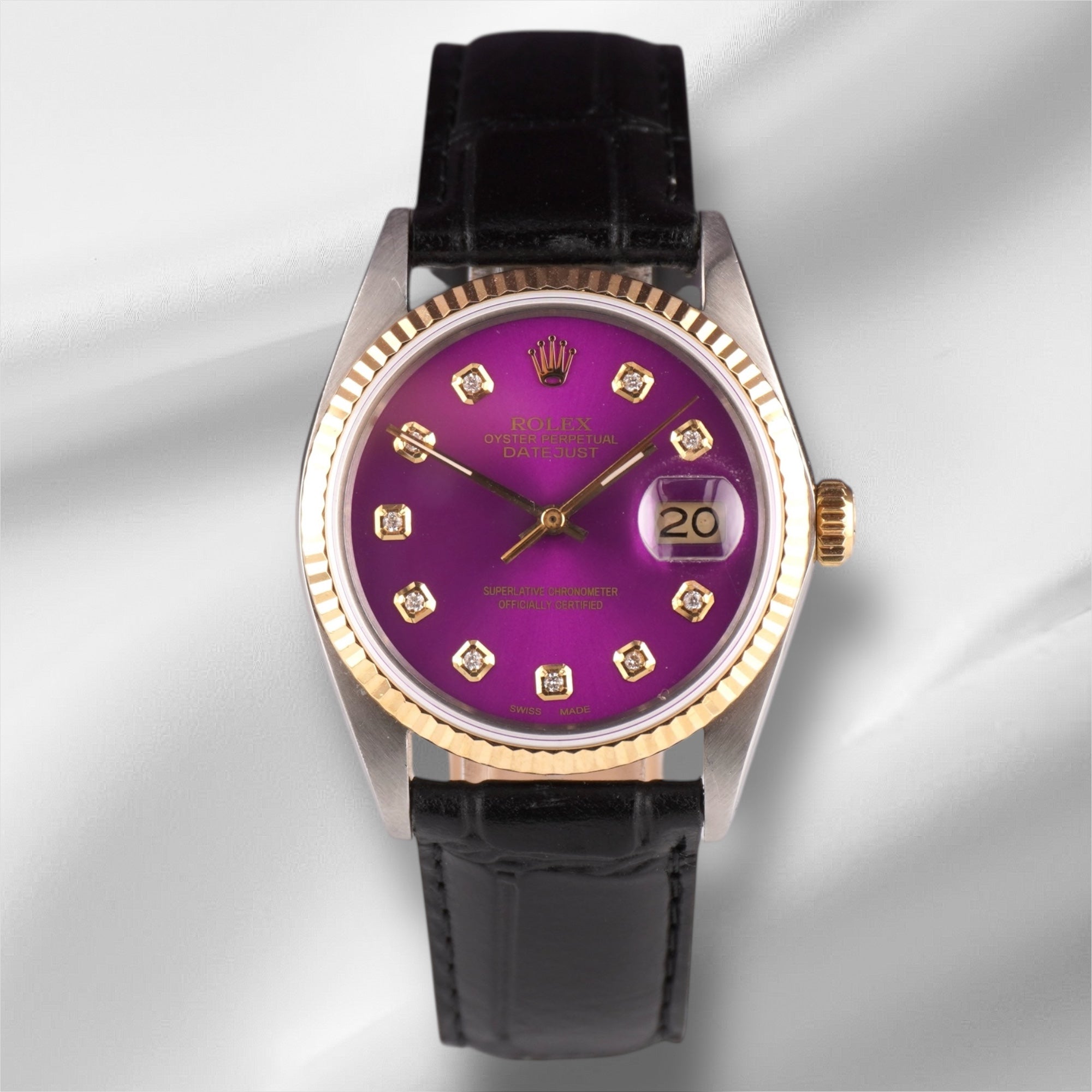 Rolex Datejust 36mm Yellow Gold Fluted Purple Diamond Dial Leather Band Watch
