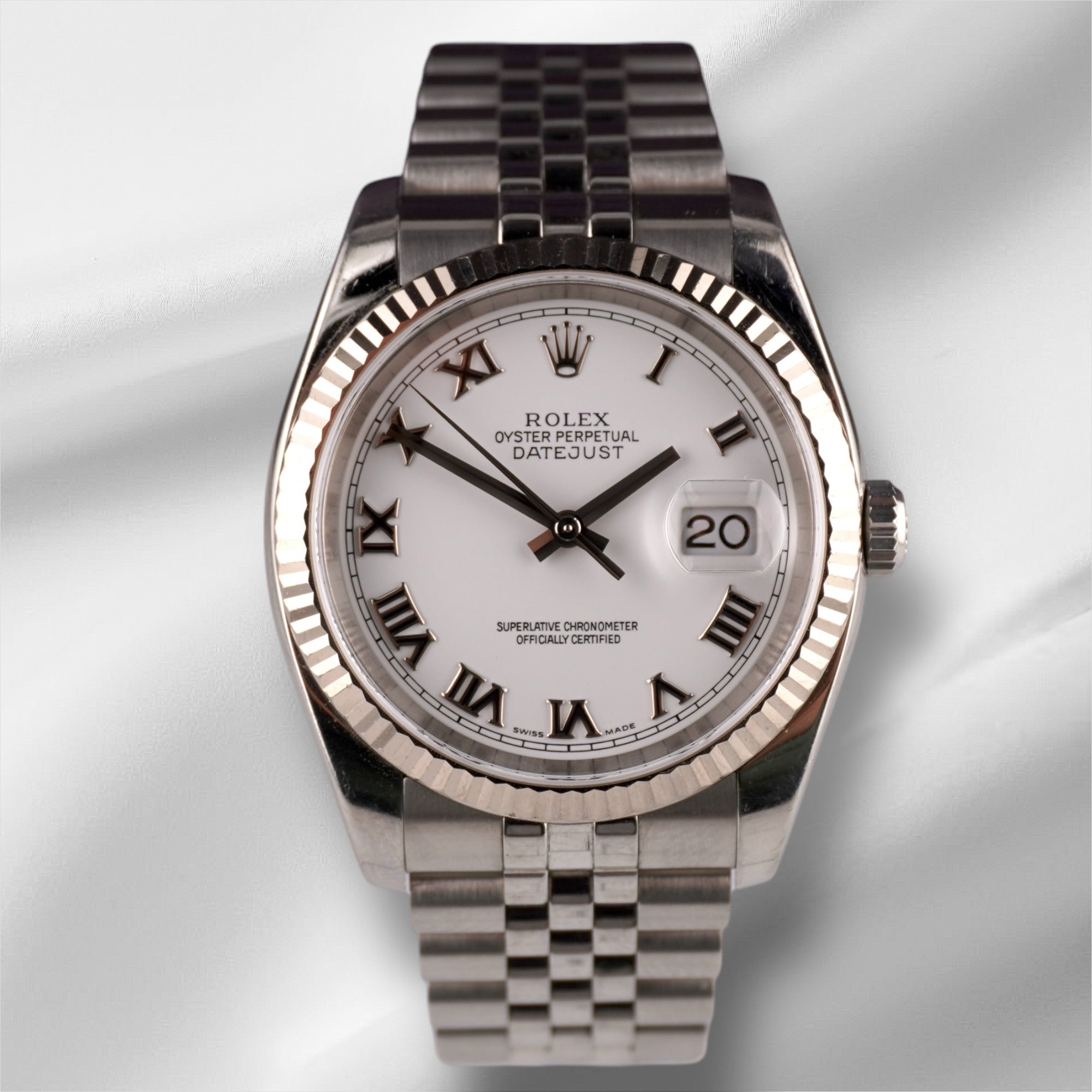 Rolex Datejust 36mm Steel White Gold Silver Roman Dial Mens Watch 116234